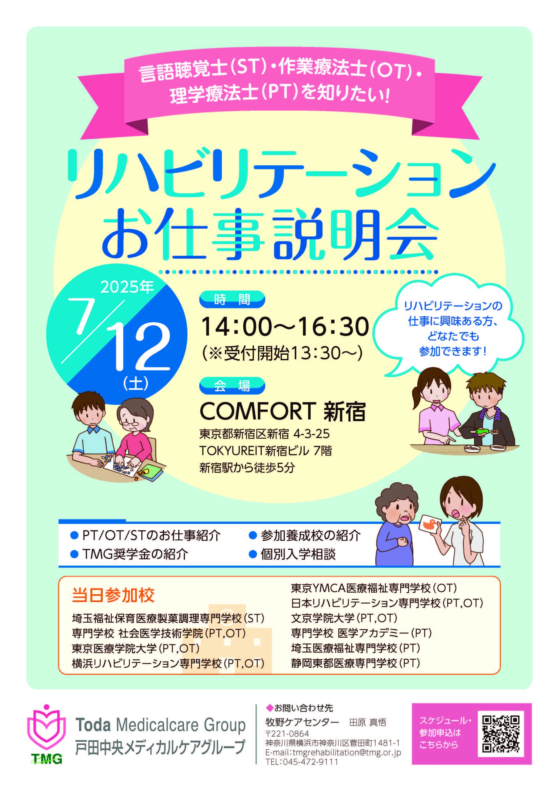 リハビリテーションの仕事に興味がある方は【リハビリテーションお仕事説明会】のご参加もお待ちしております。